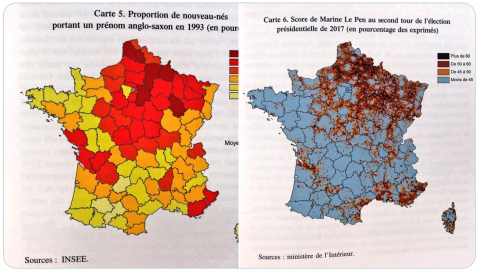 Or take the next map pair. The one on the left shows French newborns in 1993 with an ‘Anglo-Saxon’ name. The highest share of Ambers, Dwaynes, and other newborn ‘Anglos’ are found in areas colored various shades of red: light (13 percent), medium (14 percent), or dark (15 percent and up). Those areas are predominantly in the north and centre of the country – but excluding Paris and environs.