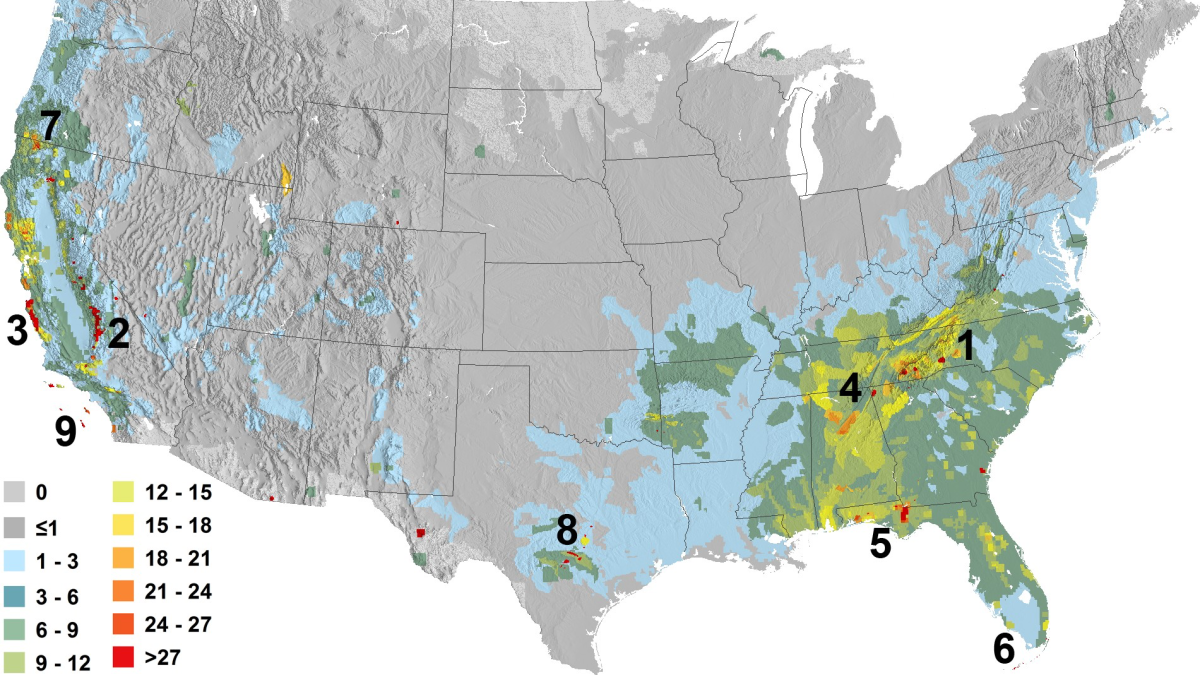 “The highest-priority areas are mostly in the Southeast, California and Texas. (They) cover a relatively small portion of the country but are inordinately important for biodiversity,” the paper says. They are: