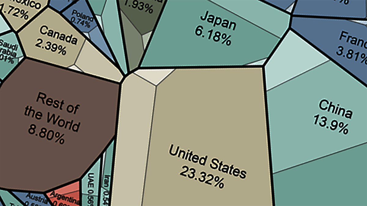 The American slice of the global GDP pie is shrinking. In 1960; U.S. GDP represented 40% of the global total. By 2014, that share had shrunk to 22%. The decline is relative — America’s economy is much larger now than half a century ago, but other countries have grown much faster. Most notably China, the economy of which trebled over the same period, from close to 5% back then to around 15% now. And, as shown by this recent Voronoi diagram (1), first published in July 2015, the American slice is still by far the biggest one.