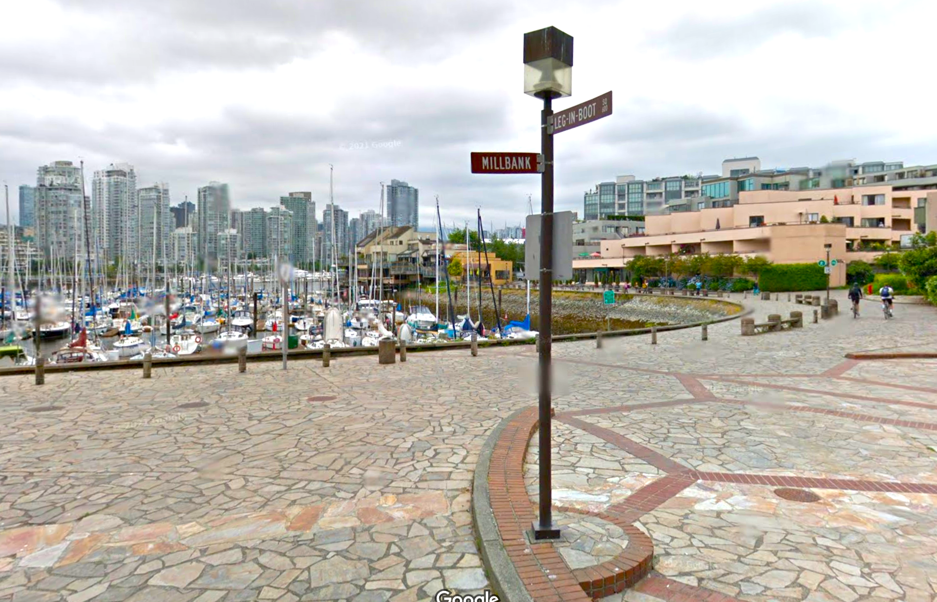 A severed leg found in Vancouver in 1887 has been memorialized with its own street sign: “Leg-in-Boot Square.” (Credit: Street View, Google Maps)
