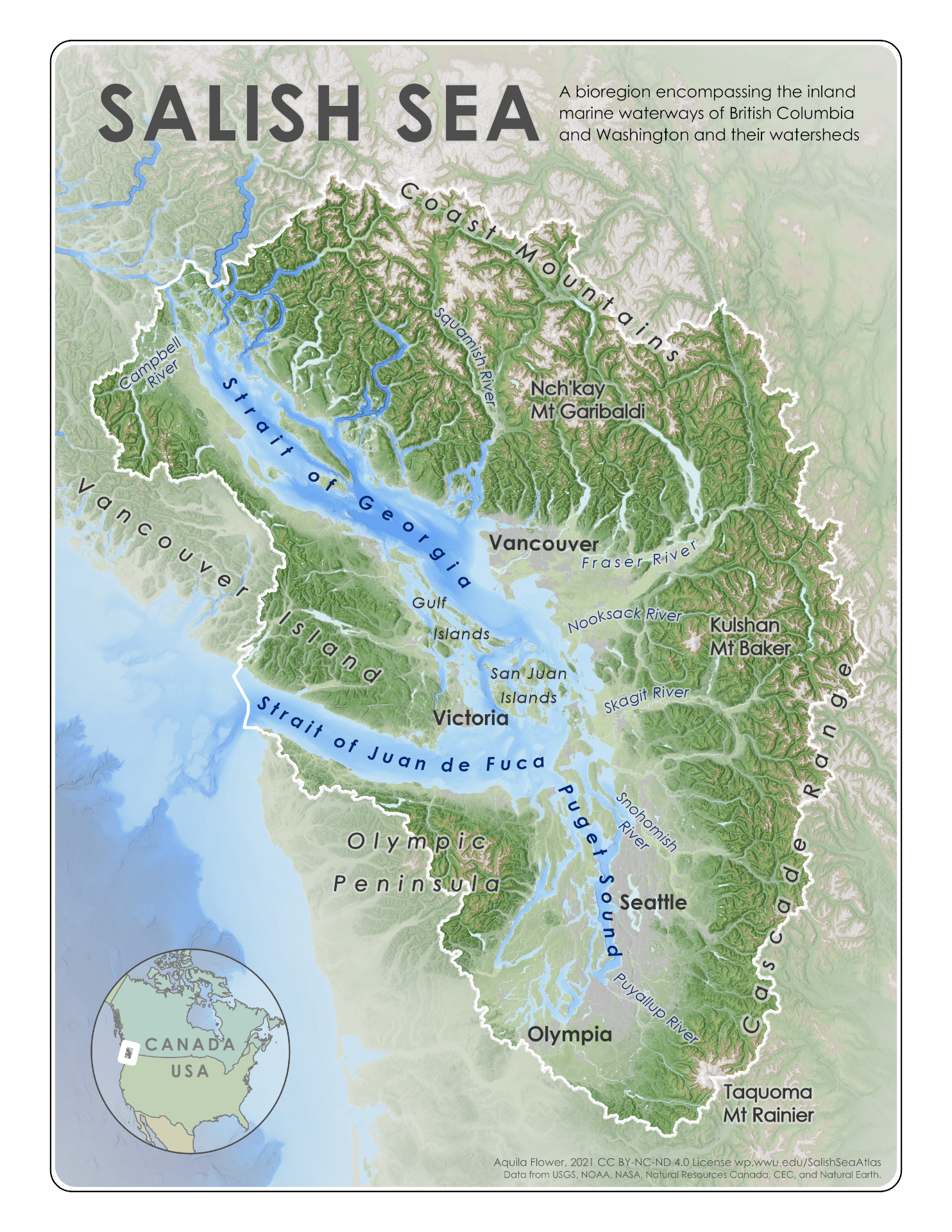First used in 1988, “Salish Sea” is the fairly new name for a bioregion that comprises three inland marine waterways straddling the U.S.-Canada border: the Georgia Strait, the Strait of Juan de Fuca, and Puget Sound. The new name complements the older ones, and does not replace them. (Credit: Salish Sea Atlas, Western Washington University)