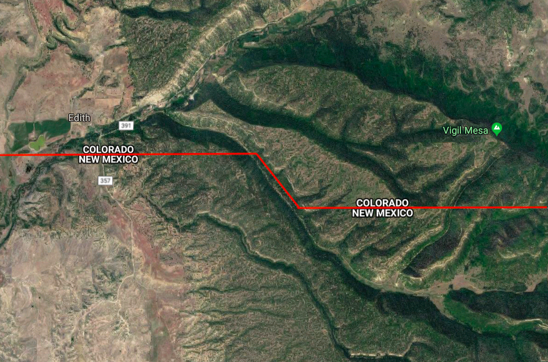 West to east, Colorado’s border with New Mexico starts out fairly straight. However, just east of Edith, the border swerves southeast for about 3,400 feet (1 km) before resuming its course due east, now 2,820 feet (860 m) further south than before.