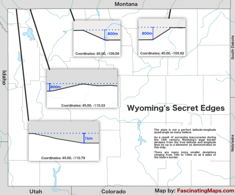 With Colorado thoroughly disqualified to as one of America’s two truly rectangular states, does that leave Wyoming holding the crown all on its own? Nope. Turns out the surveyors who plotted the Equality State’s outline were just as fallible as the Colorado set.
