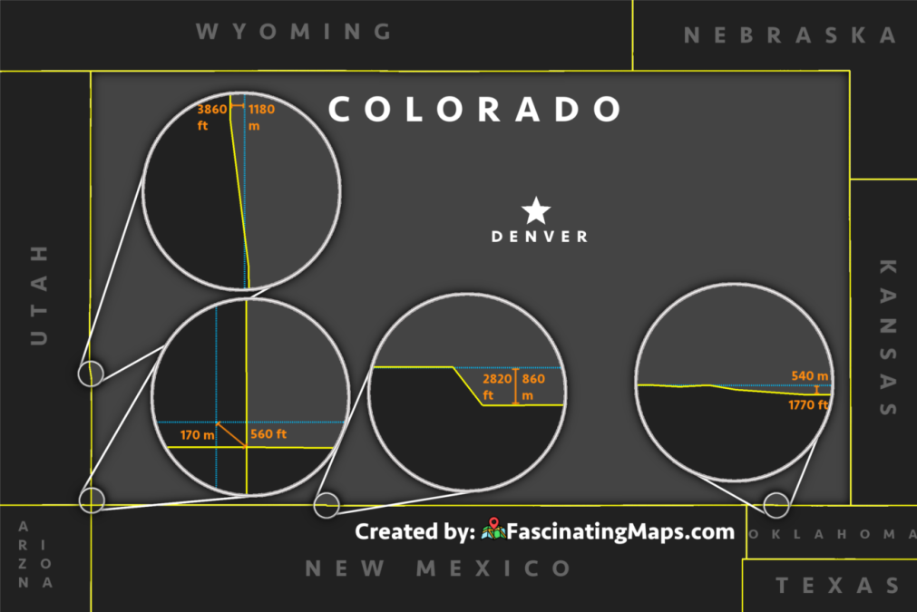 Which means that Colorado’s longitudinal borders are slightly further apart in the south. So if you’d look closely enough, the state resembles an isosceles trapezoid (3) rather than a rectangle. Consequently, the state’s northern borderline is about 22 miles (35 km) shorter than its southern one. The same goes, mutatis mutandis, for Wyoming.