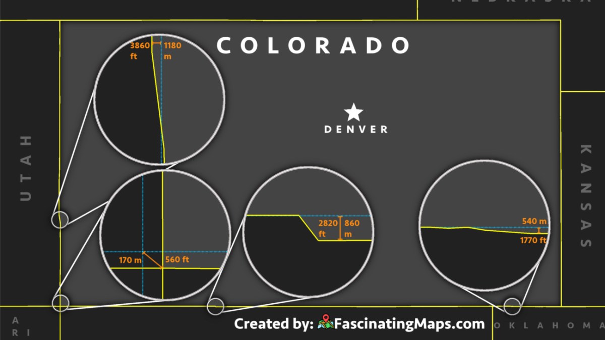Which means that Colorado’s longitudinal borders are slightly further apart in the south. So if you’d look closely enough, the state resembles an isosceles trapezoid (3) rather than a rectangle. Consequently, the state’s northern borderline is about 22 miles (35 km) shorter than its southern one. The same goes, mutatis mutandis, for Wyoming.