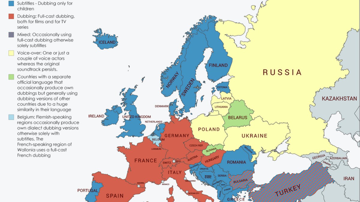 In red: dubbing markets. Dark blue: subtitles, please. Yellow: voice-over translation. In green: markets using dubs from another language (i.e. Czech for Slovakia, Russian for Belarus). Light blue: Belgium, where the Dutch-speaking north prefers subbing, the French-speaking south subbing.Image: MapChart, reproduced with kind permission