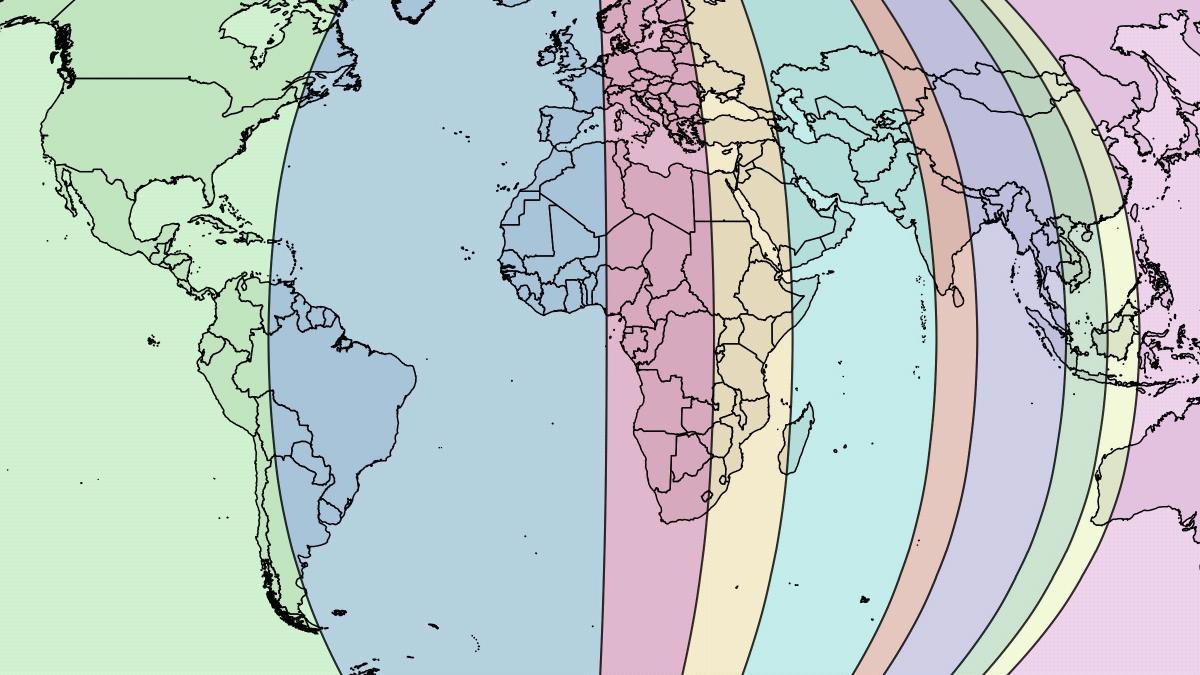 The cartogram: countries are inflated or deflated to show the difference in population size. See #96.Rearranged countries: the country with the biggest population moves into the biggest country, the second-most populous country takes over the second-biggest country, and so forth. See #490.Latitudinal and longitudinal: world population plotted out along the north-south and east-west axes. See #563.This map is a variant of the longitudinal map. It divides the east-west distribution of humanity into ten slices of equal population. Each one is home to 750 million people – a bit less or a lot more, depending on when you are reading this.