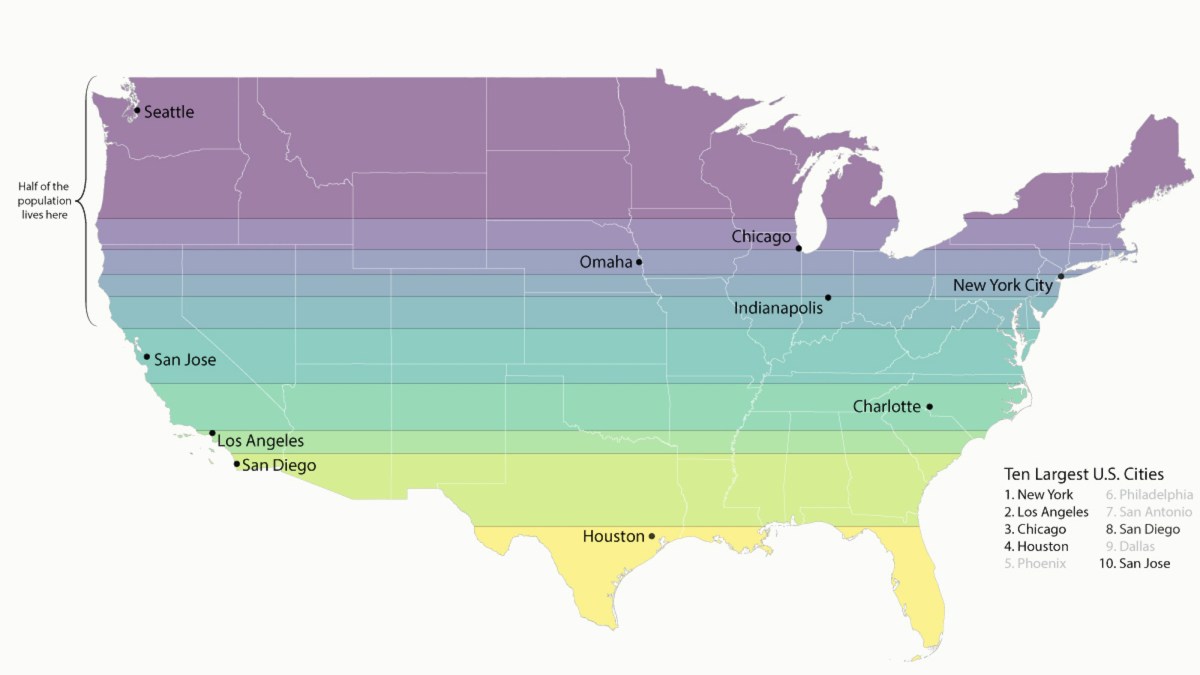 - The Chicago, Omaha, New York City and Indianapolis strips complete the northern half of the country. And indeed: 50 percent of the population occupies roughly one half of the country, from north to south.
