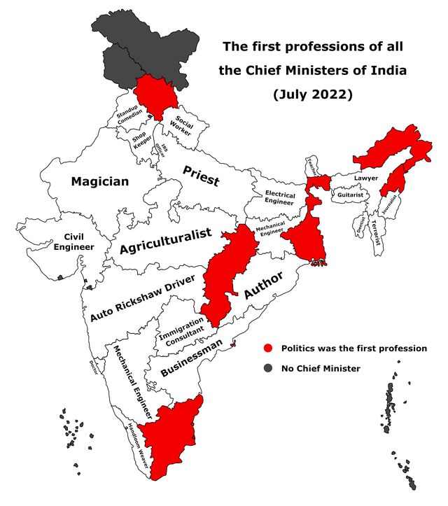 As this map shows, things get even weirder in India. The map indicates the first professions of the chief ministers of its various states. Just one lawyer, teacher, doctor, and businessman each among the bunch. Some of the more extravagant ones: