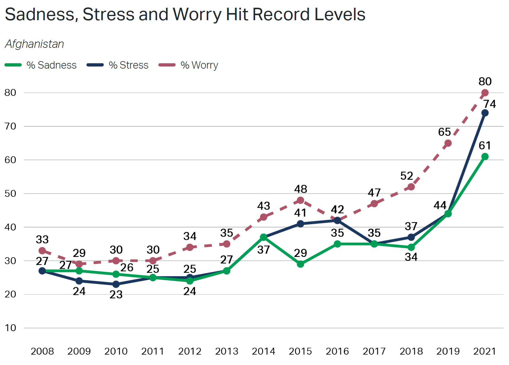 Afghans reported record levels of worry (80%), stress (74%), and sadness (61%). The country’s overall score of 59 points on the NEI was the highest score on record for the country, as well as the highest in the world in 2021. (The highest ever score was 61, reported by the Central African Republic in 2017).