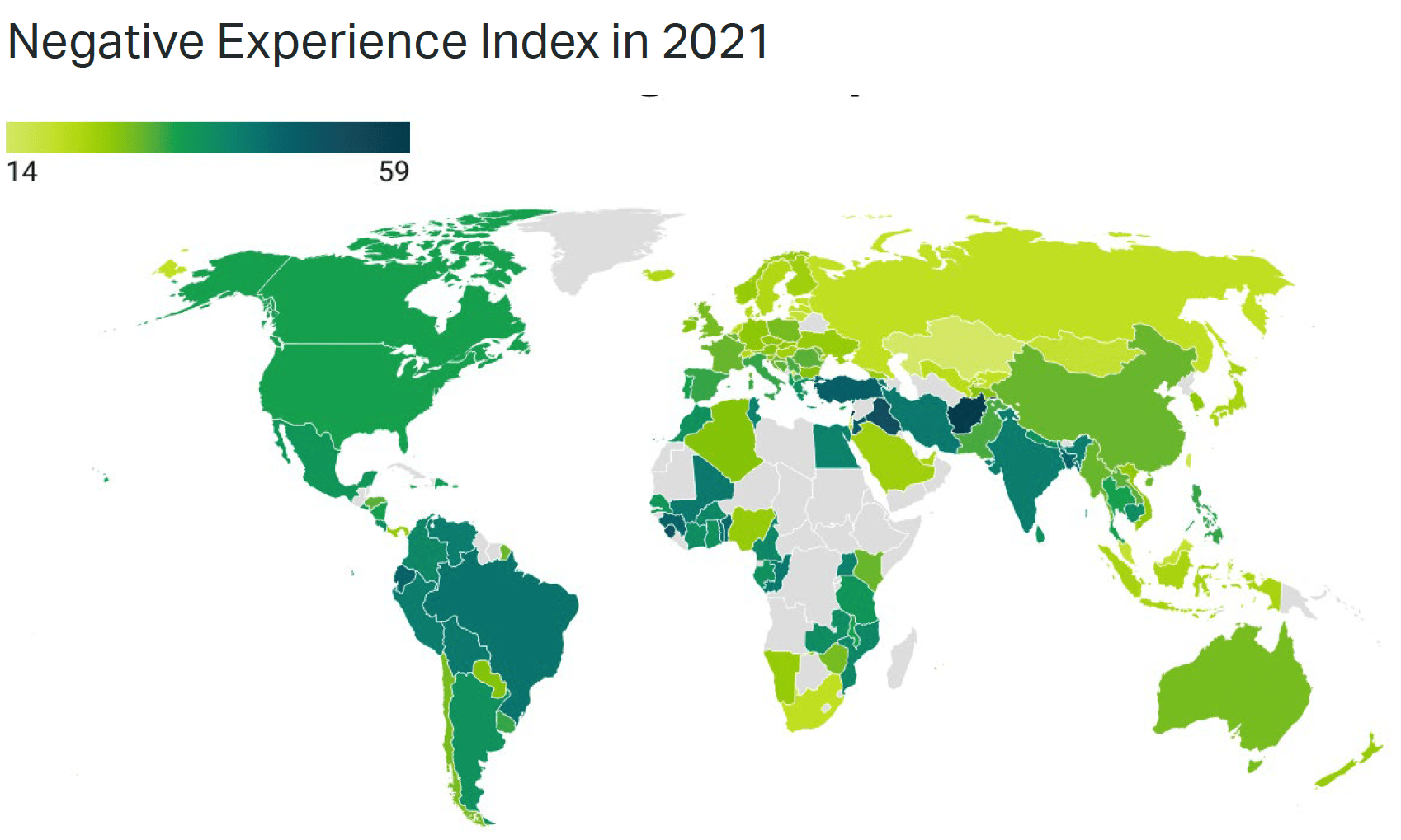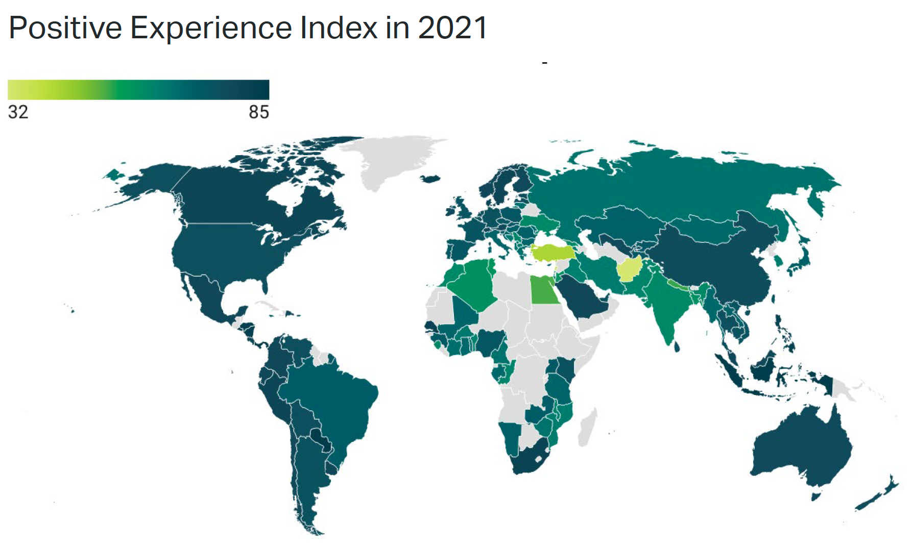 - Some certainties can’t be avoided: Afghanistan is top in negative experiences, bottom in positive experiences.