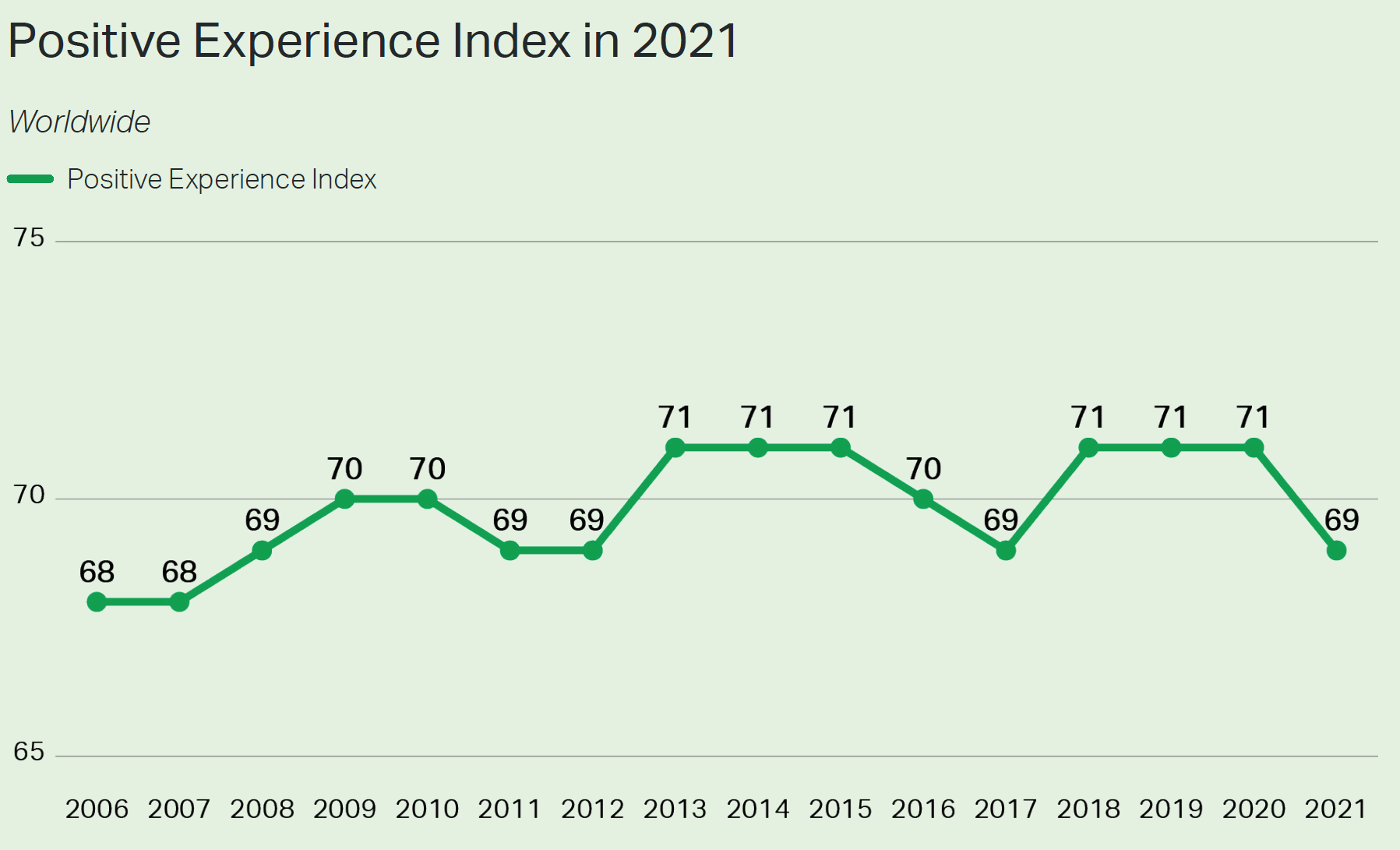 While not as bad as Afghanistan, Lebanon and Turkey also reported plummeting levels of positive experiences (dropping nine points in a single year in Lebanon and four points in Turkey). The countries with the lowest PEI were: