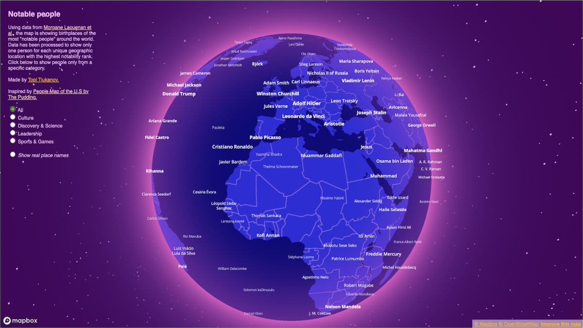 Check out Mr Tjukanov’s globe here (and his Twitter account here). The scientific article on the database of notables can be found here in Scientific Data. The cross-verified dataset can be accessed here at the Dataverse of Sciences-Po, a.k.a. the Paris Institute of Political Studies.