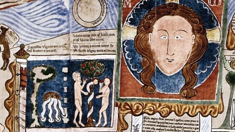 Pressing home the point that the map represents a sacred vision on geography, Christ’s head is at the top (in the east, the direction of Paradise), his feet at the bottom (west) and his hands stretching across Europe to furthest north, and across Africa toward the southernmost point. In other words, the world is contiguous with the Body of Christ.