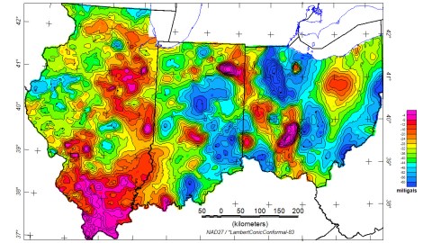 Bouguer gravity anomaly map of Illinois, Indiana and Ohio. Red means higher than average anomalies, blue means lower than average ones.