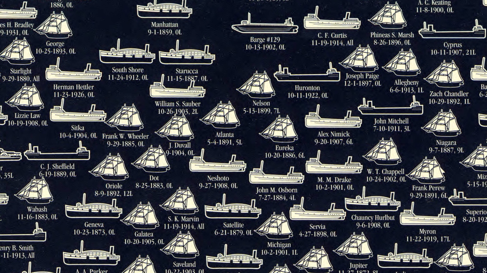 Some interesting names from Lake Erie’s shipwrecks: the Tashmoo (+1936), the Iron Age (+1909), the Sweetheart (+1913), the Chicago Board of Trade (+1900), the Handy Boy (+1888), the Faustian (picked the wrong kind of pact, apparently; +1912), the Mary Jane (+1881), and the Walk in the Water (+1821).