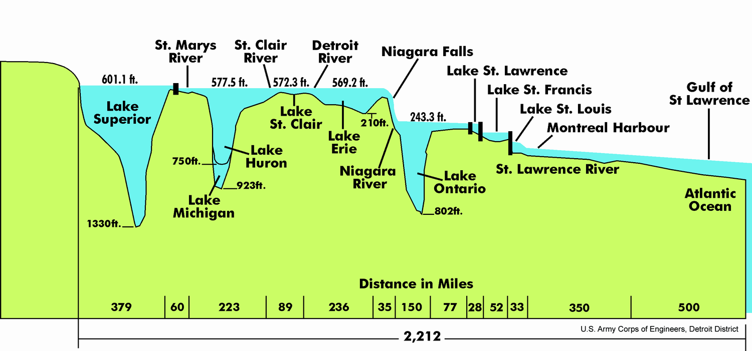 The five interconnected Great Lakes are truly massive. Combined, they hold about 21% of the world’s fresh surface water (5,472 cubic miles, or 22,812 km3), enough to cover the lower 48 states in 9.5 feet (2.9 m) of water. Because of their depth and size, not to mention the occasionally terrible weather and real danger to shipping, they are often called “inland seas,” or even “America’s fourth coast” (after the Atlantic, Pacific, and Gulf of Mexico).