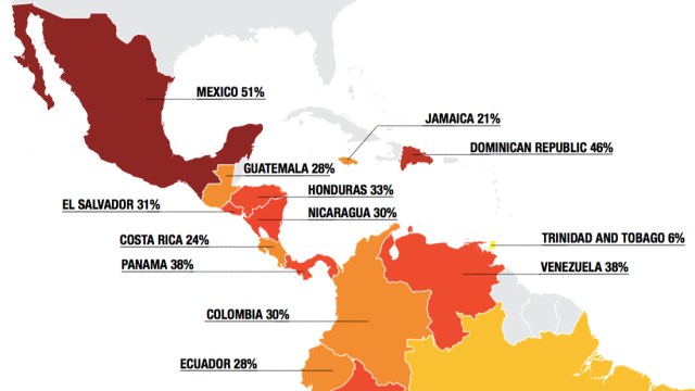 This map is included in the latest report by Transparency International on corruption in Latin America and the Caribbean, published on 9 October. Based on a survey of 22,000 people in 20 countries across the region, it shows the percentage of citizens of each country who say they paid a bribe in the previous 12 months in order to access basic services (including schools, hospitals, government officials, police officers and judges).