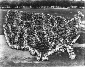 The oldest known example is this Human Map of the U.S.A., produced circa 1925. It shows what must be several thousands of people seated to produce a map of the United States. The outline of the states is formed by women wearing white, with the padding provided by men in dark uniforms. Seating arrangements have been carefully laid out to compensate for the camera’s angle. Even though the field on which the cartographic extras are positioned slopes back, this appears to be a perfectly top-down view of the State of the Union around that time (Alaska and Hawaii would join only in the late 1950s).