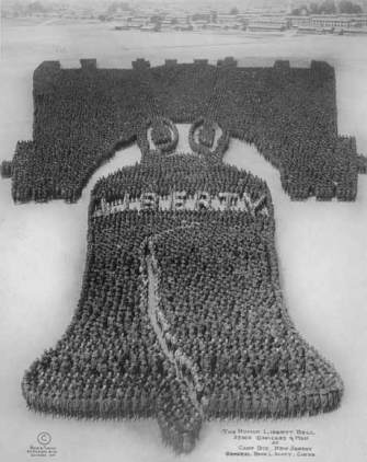 In the late 1910s, Mole produced a number of these so-called “living portraits,” usually depicting American patriotic themes, such as the Statue of Liberty, military insignia or even the face of President Woodrow Wilson. For The Human Liberty Bell, Mole assembled 27,000 troops stationed at Camp Dix in New Jersey in the shape of that national icon.