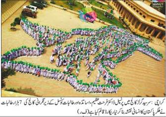 This one, produced by Sir Syed Government Girls College in Nazimabad, was made with the help of what appears to be a few hundred students, dressed in white, holding a green piece of cardboard over their head. Several news outlets ascribed no less than 7,000 students to the map; judging from the picture, that seems a bit much.