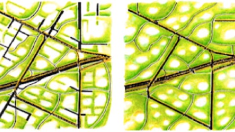A bit further in the book, Glover shows how a particular junction of traffic arteries could turn from a place where 3,000-pound cars propel 150-pound people along concrete and asphalt streets to an environment in which most physical and emotional needs are met within walking distances. Cars are gone.