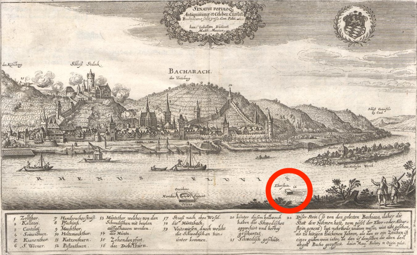 Some of the more famous ones are gone now. The Altarstein or Elfenstein was a hunger stone in the Rhine near Bacharach, which in the 19th century was thought of as a Roman altar to Bacchus (hence the alternative Latin name “Ara Bacchi”). If it was visible due to low water levels, it was interpreted as predicting a good vintage. Victor Hugo saw and described it on his trip along the Rhine in 1840. Considered a danger to shipping, the stone was dynamited in 1850.