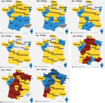 By that time, however, Patrick has taken over Paris, and Nord-Pas de Calais, and other regions. Neither of these contenders will defeat Jean, though. That honour goes to yet another surprise candidate, Philippe, who in 1955 takes Paris, and three regions north of it.