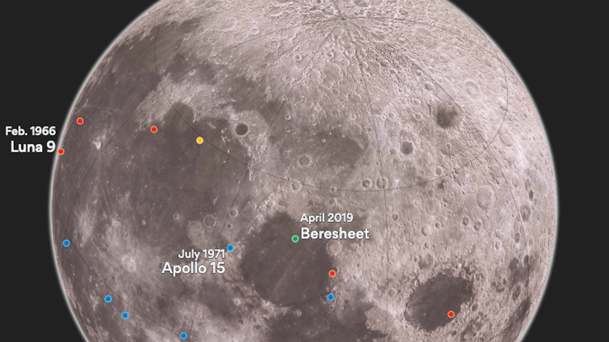 The four lunar superpowers in one map: the Soviets (Luna 9), the Americans (Apollo 11), the Chinese (Chang’e 3) and the Israelis (Beresheet).