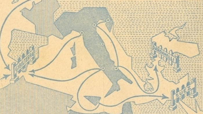 The same can be said for the three gates blocking Italy’s exit from the Mediterranean: Gibilterra (Gibraltar), Suez and the Dardanelli (Dardanelles). All controlled by foreign powers, making Italy dependent on their good will for the exit and entrance to ‘their’ sea. The unspoken implication is equally belligerent.