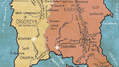 The Ey river, rising just south of Guthen Bay and flowing all the way down to the Gulf of Charisune, forms most of the border between both countries. Like its opposite, the capital of Orgoreyn is located in the south, on a river, the Kunderer. While Karhide is a kingdom composed of ‘nation-domains’, Orgoreyn is a Great Commensality, divided into 33 districts.
