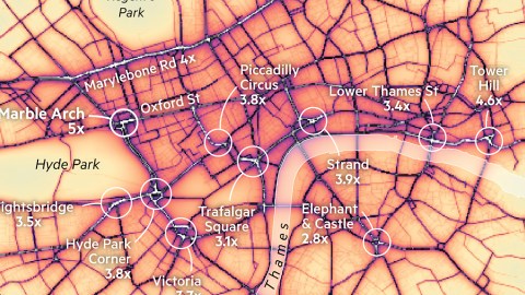 Elephant & Castle is the only pollution hotspot below the Thames and, perhaps because it’s relatively isolated from other black spots, also the one with the lowest multiplication factor (2.8 times the maximum level).