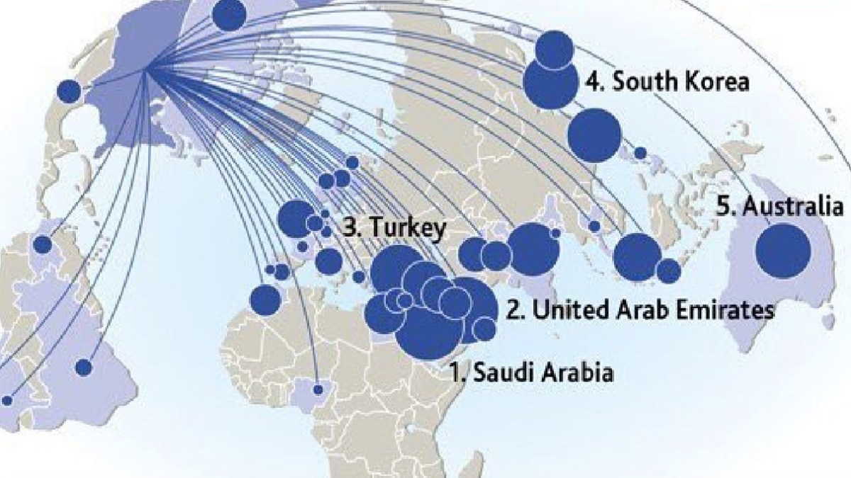 Each of the four maps mentions the five major recipients of that country’s arms exports – providing a peek into each exporter’s geopolitical priorities. As for America, they seem to be in the Middle East, mainly. The five biggest buyers of U.S. military hardware were, in descending order: Saudi Arabia ($4.6 billion), the United Arab Emirates ($4.2 billion), Turkey ($3.1 billion), South Korea ($3.1 billion) and Australia ($2.9 billion).