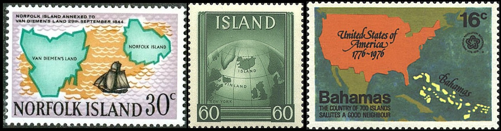 These maps also do political work, but in a slightly more subtle way: by enlarging the country of issue. If it were represented at scale, Norfolk Island almost would be invisible on the first stamp. Iceland definitely isn’t bigger than Ireland and Great Britain put together. And the Bahamas don’t quite stretch that far into the Atlantic. But who needs geographical accuracy when the only victim of your territorial grandiosity is the uncomplaining ocean?