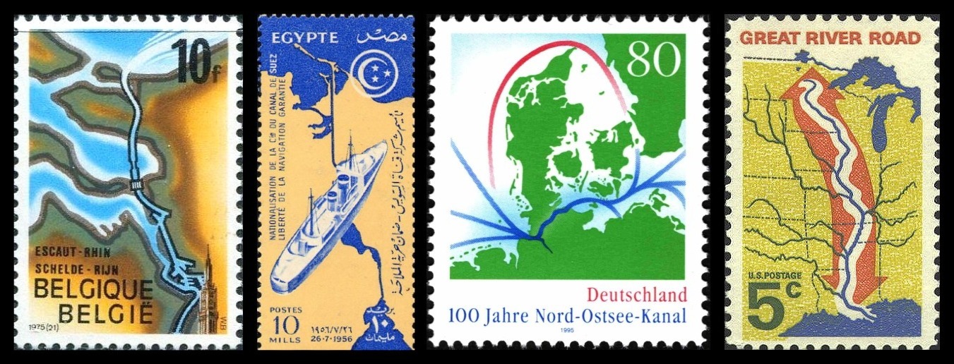 Canals are a favorite marker of progress. Here we have Belgium bragging about the Scheldt-Rhine canal, which links its port of Antwerp to its Dutch competitor Rotterdam. Egypt celebrates the nationalization of the Suez Canal as a guarantee for the freedom of transit. Germany’s stamp shows how the Kiel Canal (a.k.a. the Nord-Ostsee-Kanal) shortens the trip between the North Sea and the Baltic (while also robbing Denmark of its leverage over shipping through the Kattegat). The U.S. stamp is the odd one out. The operating word here is “road,” not “river.” This scenic byway shadowing the Mississippi was first proposed in 1936, but completed well after WWII.