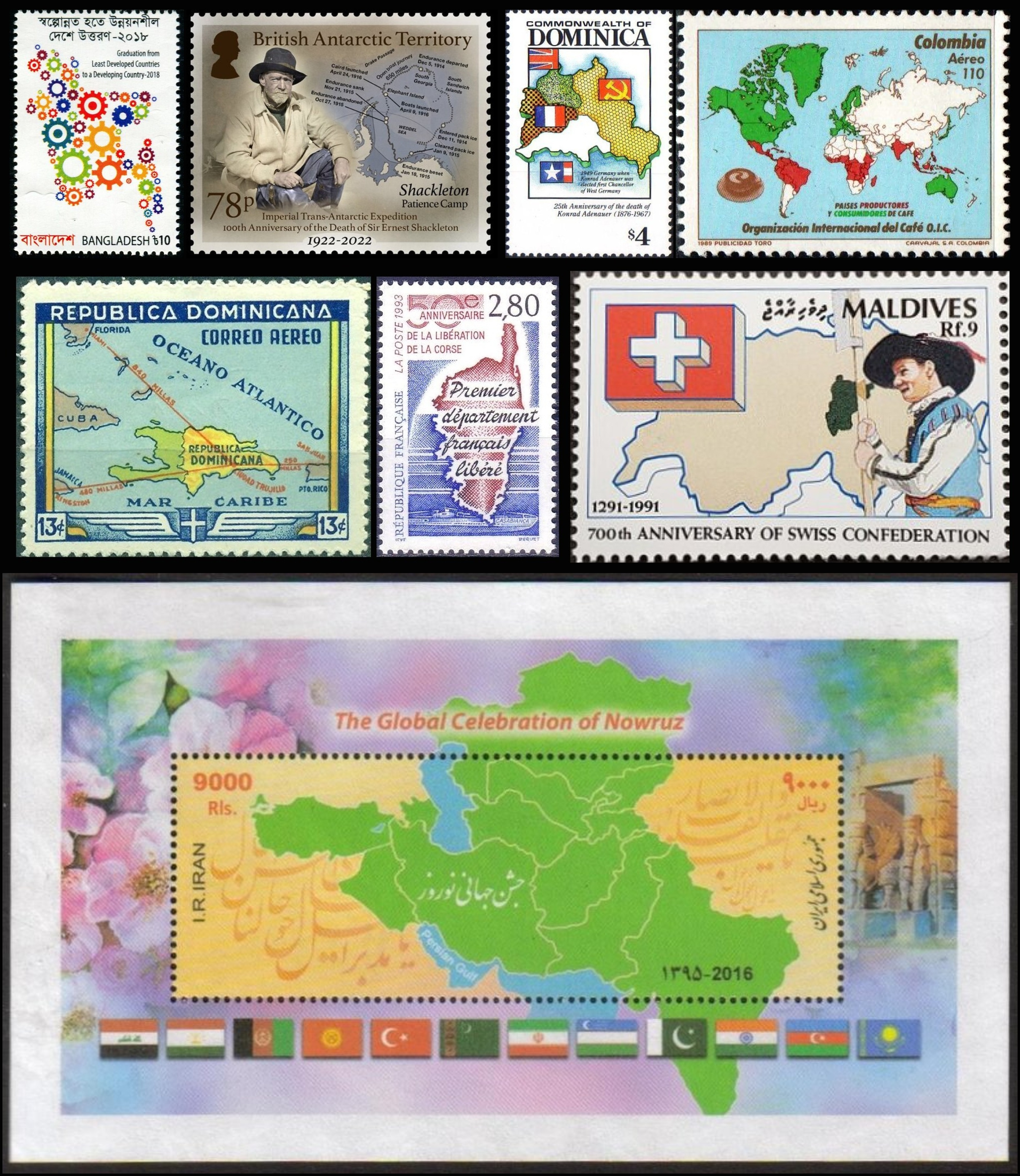 You want to learn something? Lick a stamp. These teach you that in 2018, Bangladesh graduated from “least developed” to “developing” country; which route the British explorer Shackleton took on his “Imperial Trans-Antarctic Expedition” (1914-17); the four occupation zones into which Berlin was divided after World War II; where coffee is mainly produced (in red) and where it is mainly consumed (in green); how far it is by air from Miami to the capital of the Dominican Republic (340 miles); which part of France was first liberated from the Nazis (Corsica, not Normandy!); how small the Swiss confederation was when it began in 1291; and where Nowruz (a.k.a. Persian New Year) is celebrated (in a huge, contiguous zone from Istanbul to Kolkata).