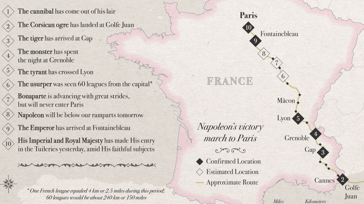 For the first time, a map that shows Napoleon’s lightning march to retake power in Paris, and the headlines that accompanied him there.
