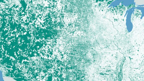 In general, there’s relatively little emptiness east of the Mississippi, with notable exceptions in northern Maine (the largest empty region in the eastern half of the country). Another green blob, on the Florida-Georgia state line, is a swampy area corresponding to the Okefenokee National Wildlife Refuge on the Georgia side, and the Osceola Wildlife Management Ara on the Florida side. In southern Florida, the Everglades light up green. Other notable green zones: northern Minnesota, northern Wisconsin, Michigan’s Upper Peninsula.