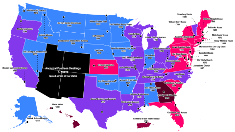 As demonstrated by this map of the oldest buildings for each U.S. state (plus Puerto Rico), most of the nation’s ancient real estate is even younger: 15 buildings are from the 19th century, 18 are from the 18th century. A further dozen places on the map were built by conquerors and colonizers after the European arrival in the Americas, clocking in at half a millennium or less.