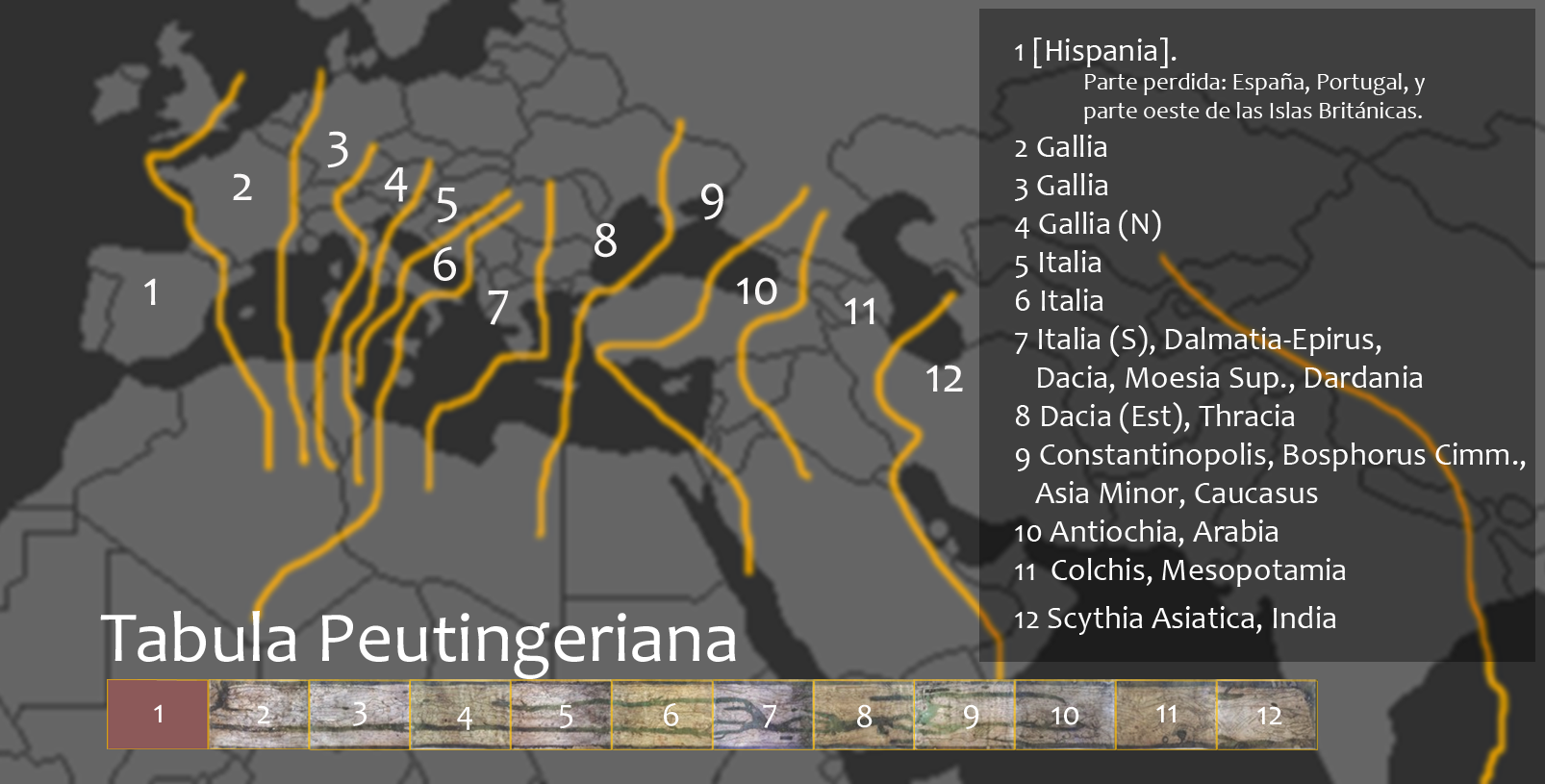 The Peutinger, for all its historical value, is not complete: It misses Britain and Spain. The roads of those Roman provinces were reconstructed using other sources, including the Itinerarium Antonini, a register (rather than a map) of Roman roads, way stations, and distances, possibly based on an empire-wide survey carried out in the time of Augustus.