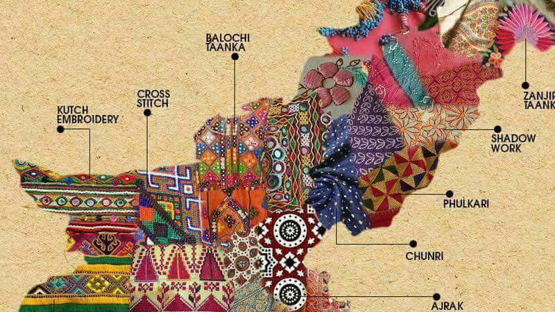 Only colour and beauty here, from the traditional Ralli quilts made in southern Balochistan over the eye-catching Phulkari – embroidered shawls and head scarfs – from Punjab to the Dandi Taanka embroidery of Kashmir in the north, and much in between.