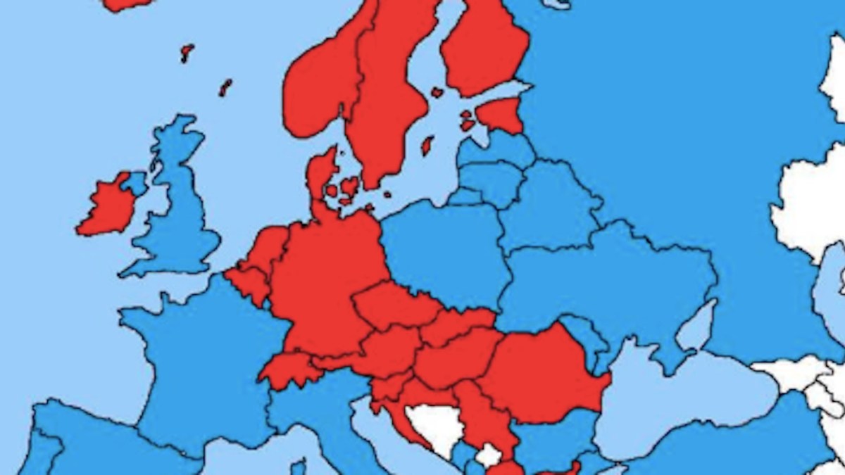 It shows Europe divided into two blocs. That’s not unheard of in history. It’s just that these two are bafflingly unfamiliar. It’s not the EU versus the rest, nor NATO versus the Warsaw Pact. Not Triple Alliance vs. Triple Entente. Neither Napoleonic France and its satellites versus Britain and its allies. Rome vs. barbarians? Nope.