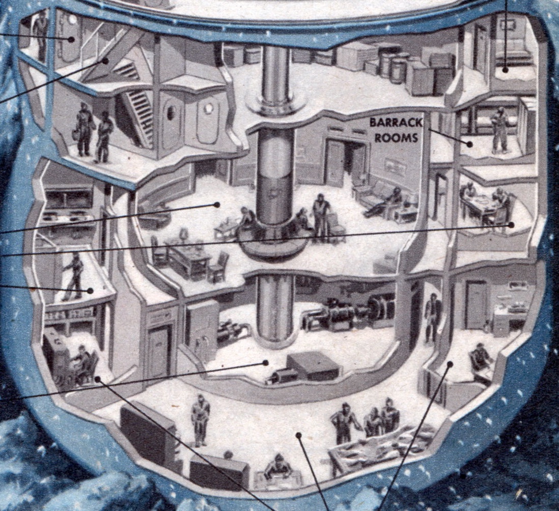 Hiding beneath the dome is a 360°-revolving radar antenna, that can fully retract into a bomb-proof pit. A circular balcony at the foot of the antenna doubles as an indoor exercise track for the troops staffing the fortress. Deep below the antenna, there are spaces for the people and things that make the antenna work: barracks for the soldiers and slightly more spacious quarters for the officers. There is a lounge, a mess hall, and a library.