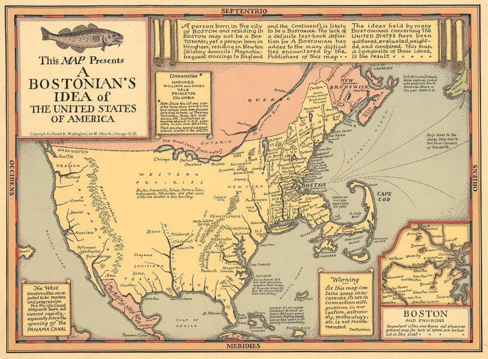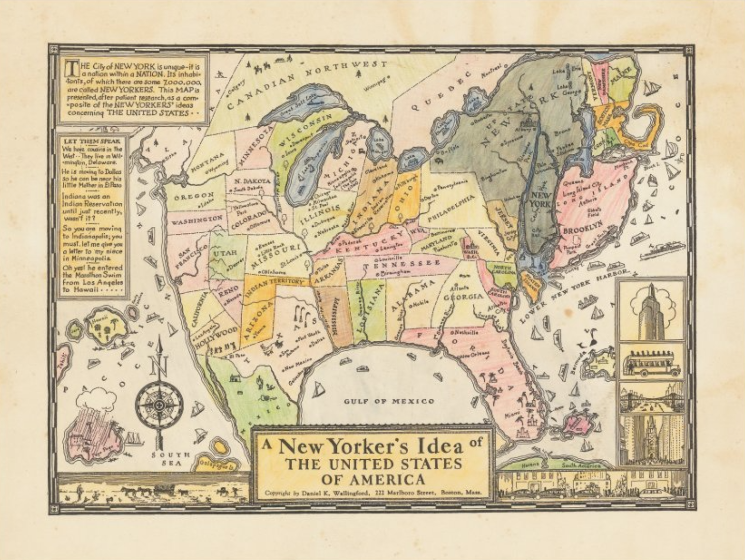 Wallingford, an industrial engineer by trade, also dabbled in mapmaking. In 1932, he had 100 copies printed of his “A New Yorker’s Idea of the United States of America” to distribute among his friends as Christmas presents. It proved such a hit that he had to issue a second print run, which he began to distribute via mail order.