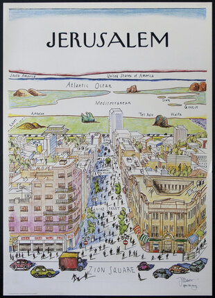 So, whenever the Steinberg map gets rolled out, parodied or homaged — as in this “Steinberg map” version of Jerusalem — let’s give credit where it is due by honoring its actual ancestor, the 1922 McCutcheon map.