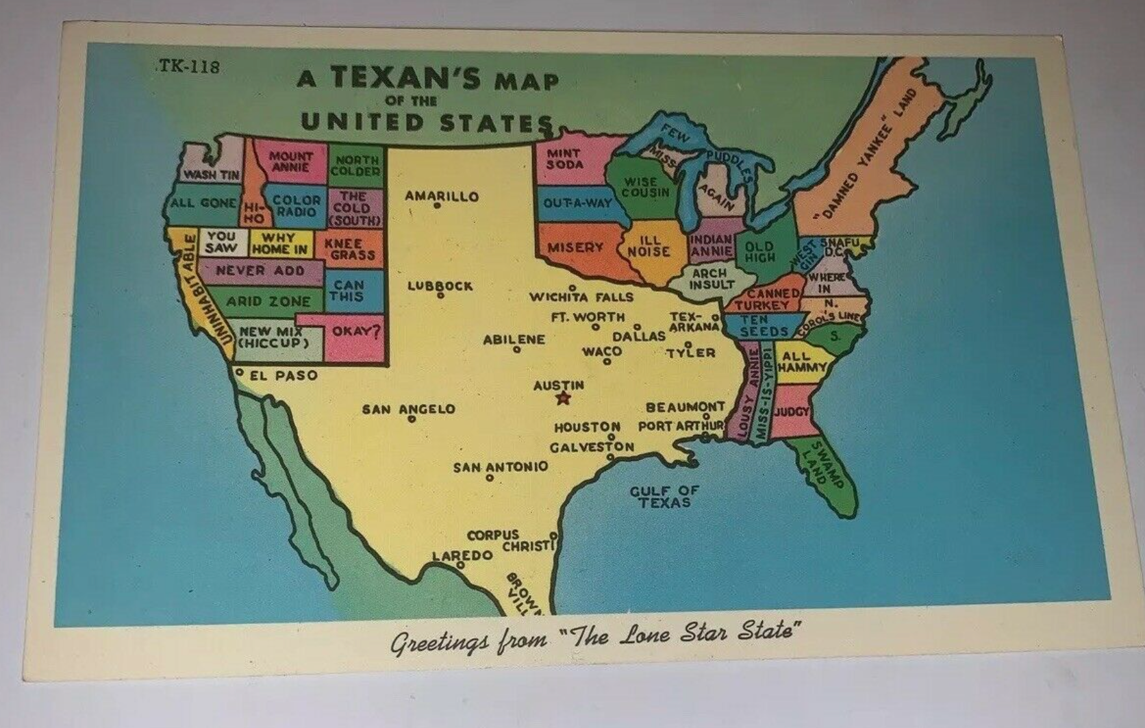 Another typical example of a chauvinist map of the “hypertrophy” persuasion is this classic postcard, showing “A Texan’s Map of the United States,” with the Lone Star State so big that it divides the rest of the country in two. The diminutive states have funny, misremembered names: “Arid Zone,” “Ill Noise,” “Canned Turkey,” etc.
