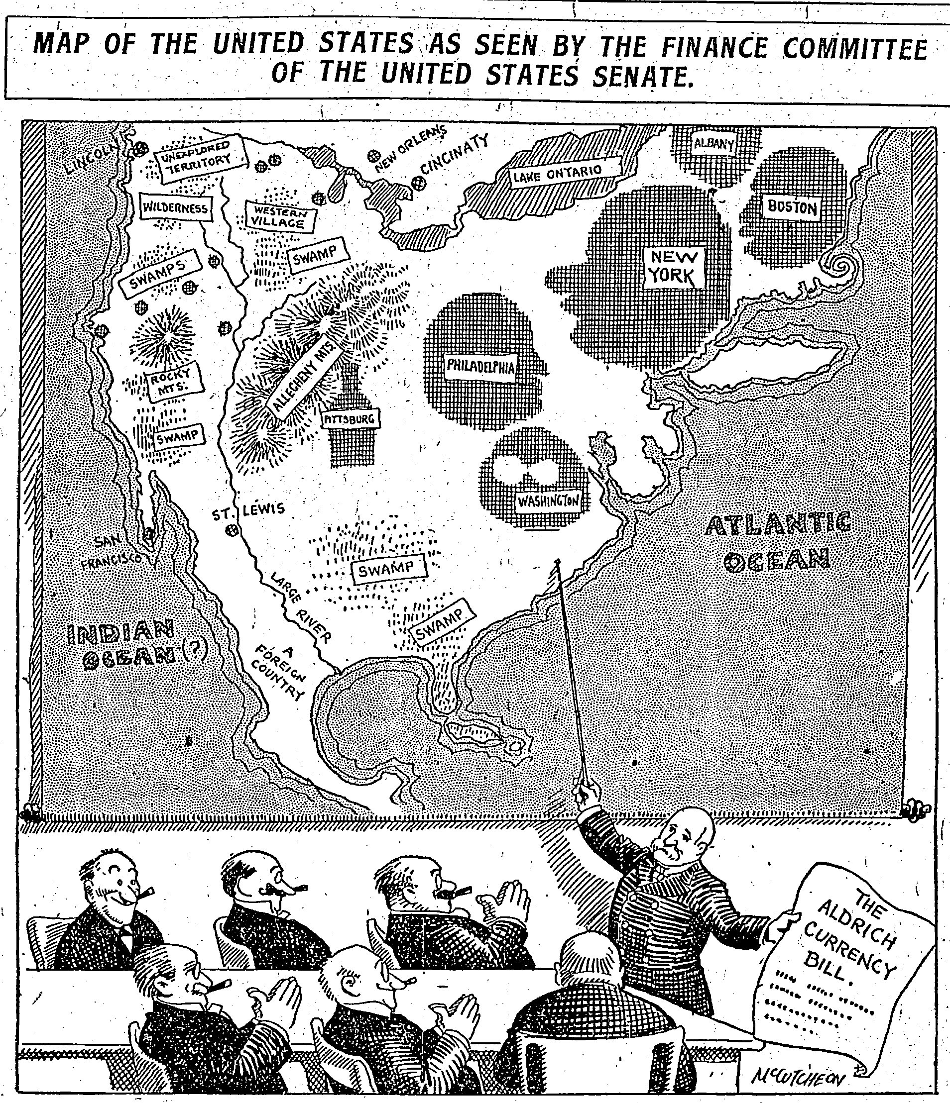 But we’re over-explaining the cartoon. Titled “Map of the United States as seen by the Finance Committee of the United States Senate,” it mocks the attitude in government circles of focusing on the big eastern cities and neglecting the rest of the country. The pointer points toward Washington, Philadelphia, New York, Boston, and Albany, which all loom large on the map. Pittsburg (then for a few more years without its final “h”) is shaped like a bottle, no doubt in reference to its brewing prowess. Pointedly absent is Chicago, home of the Tribune.