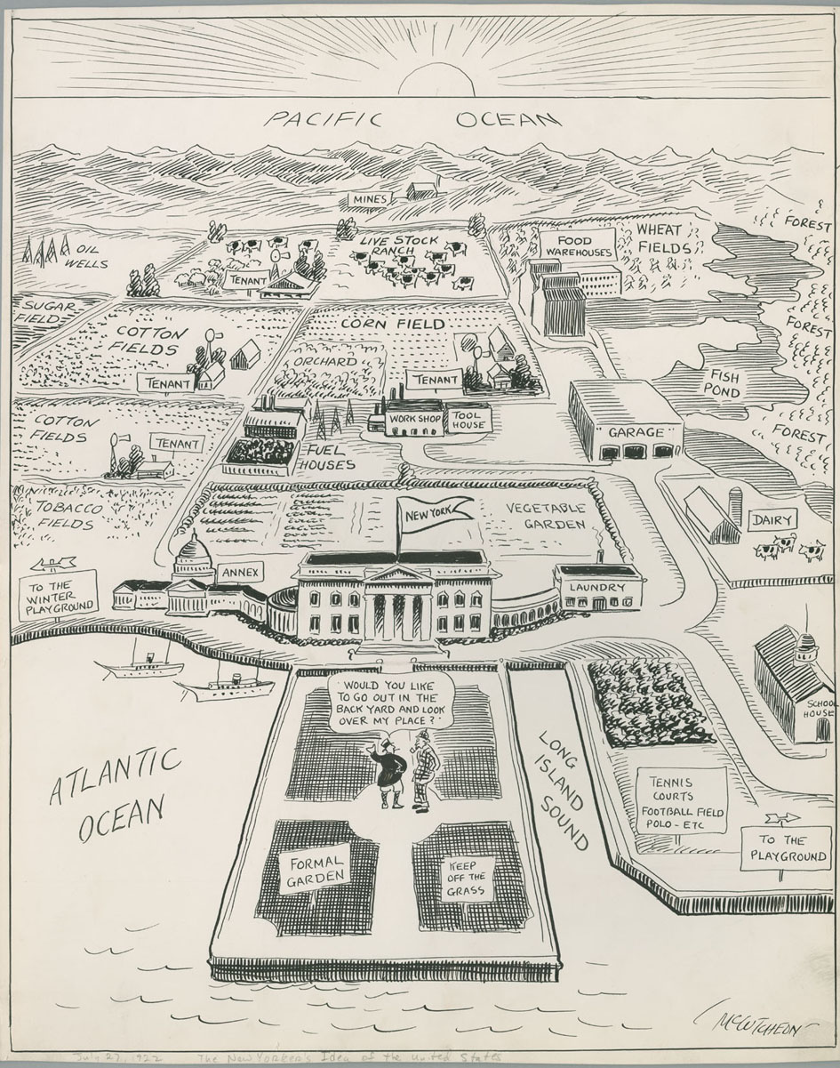 Published in 1922, the cartoon is called “The New Yorker’s Map of the United States.” We are hovering over the Atlantic and looking over New York all the way to the Pacific. “Would you like to go out in the backyard and look over my place?” asks the host of a visitor dressed in tweed and deerstalker (i.e., a British guest).