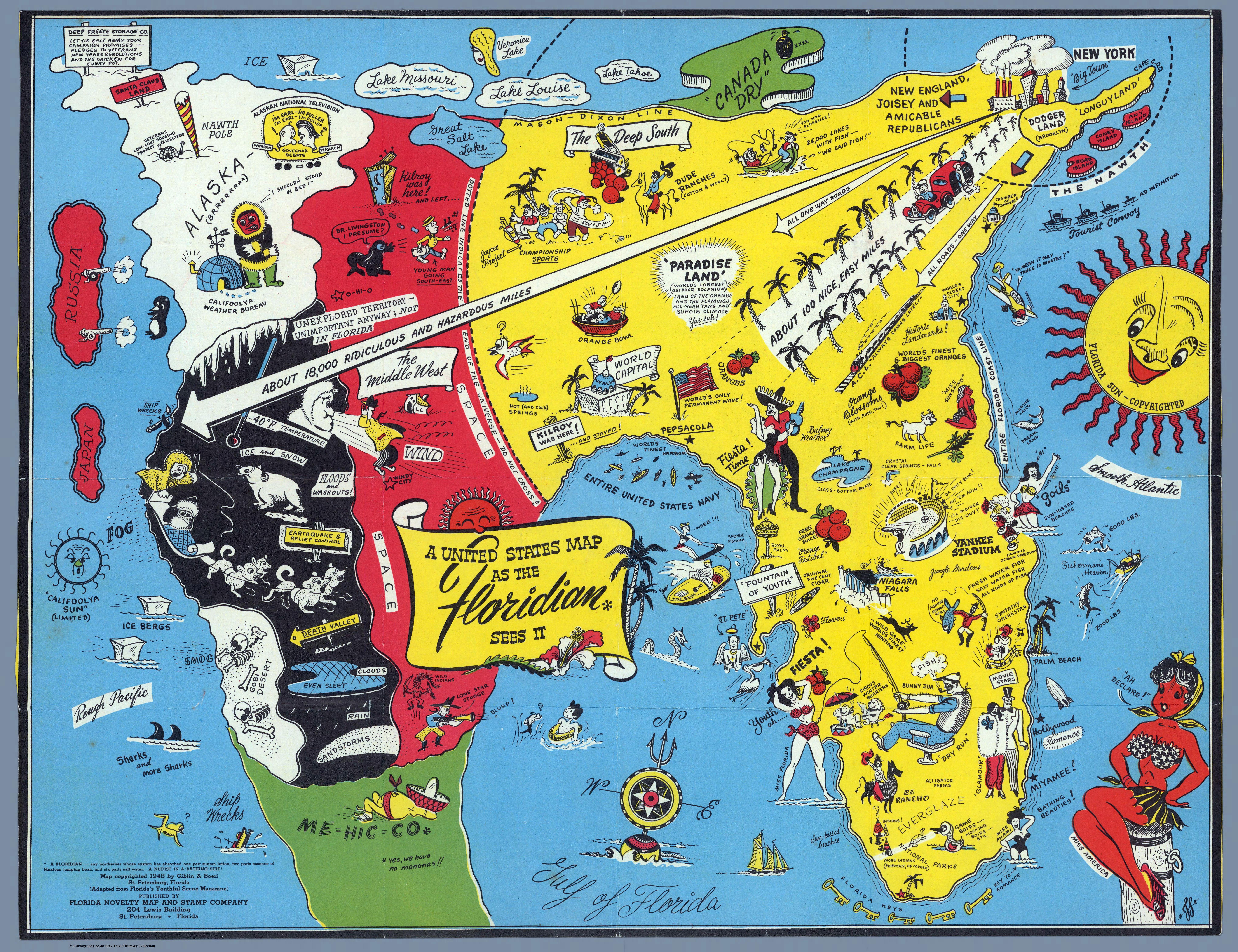 Wallingford’s maps gave others the idea to oversize particular parts of the country for humorous effect. A nice example is this “United States Map as the Floridian* Sees It,” which was published in 1948 by the Florida Novelty Map and Stamp Company in St. Petersburg, Florida. The map was drawn by Jack Swenningsen, a Danish native and St. Petersburg resident.