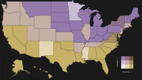 This bivariate (4) map shows both where the ‘whiter’ school districts are: in the purple states; and where the more diverse states are: in the yellow states. “Obviously, the data is partly correlated: a high proportion of whites always leads to low diversity; but still I found the pattern quite interesting,” says Mr Scherer. Low diversity also occurs in places with few white students, e.g. New Mexico and Mississippi; and New York manages to be both quite white and fairly diverse.
